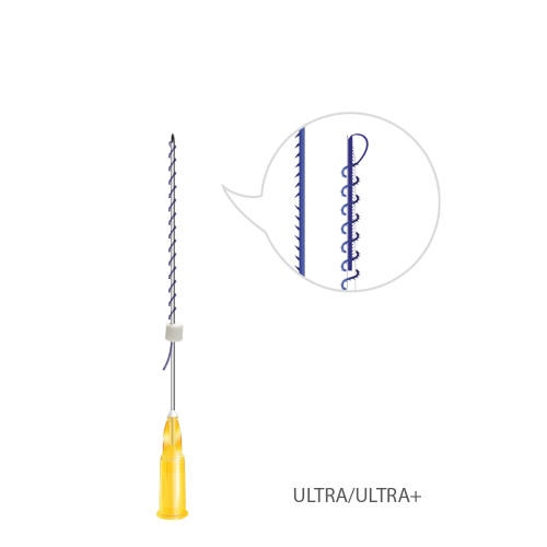Les fils Ultra + sont à base de polydioxanone, également connu sous le nom de PDO, qui est biocompatible et peut être entièrement décomposé par l’organisme. Cependant, la particularité des Rainbow Threads Ultra + réside dans leur forme, qui se présente comme suit : un fil à crochets est enroulé en spirale autour de l’aiguille et linéaire dans l’aiguille.
